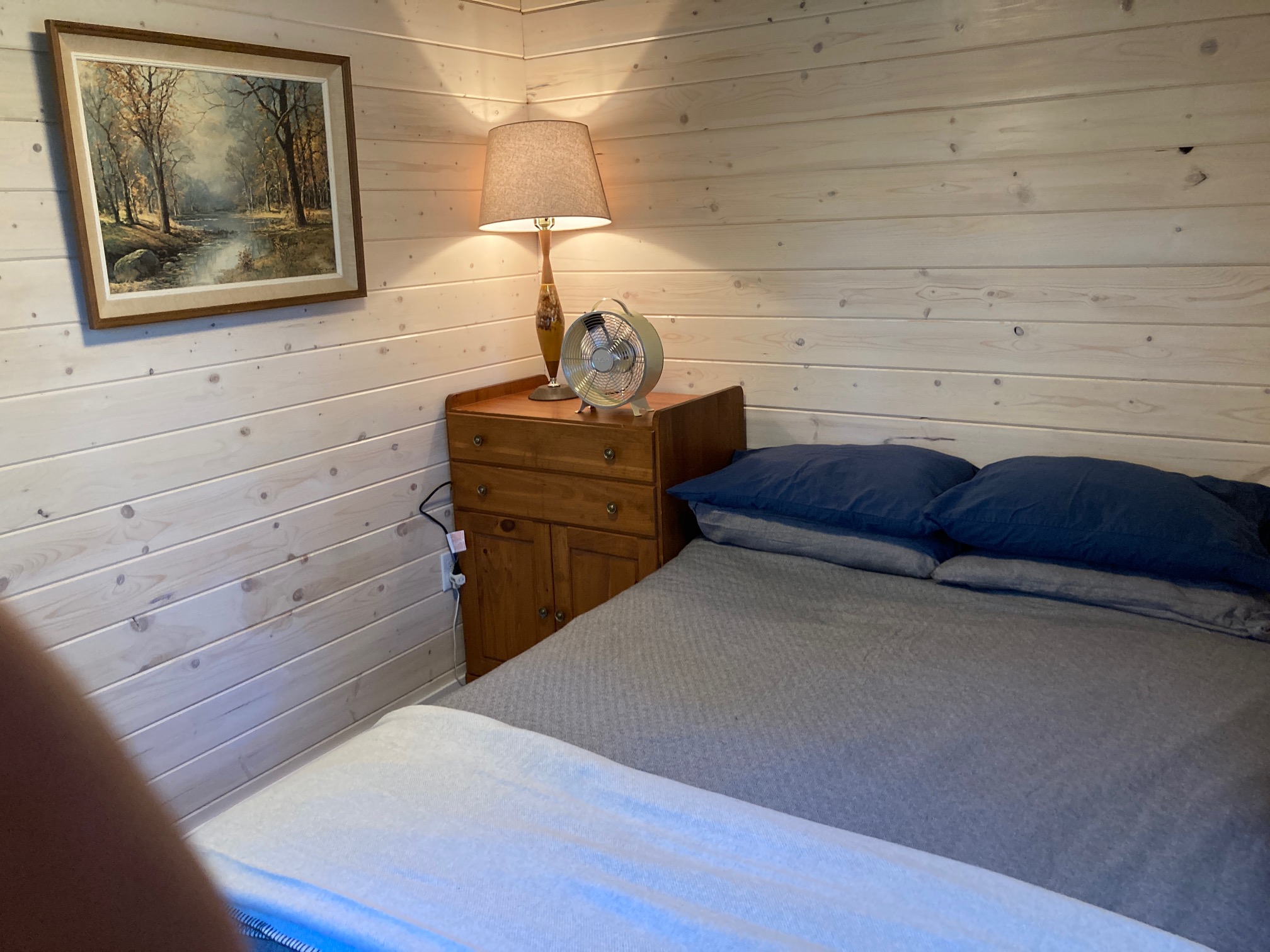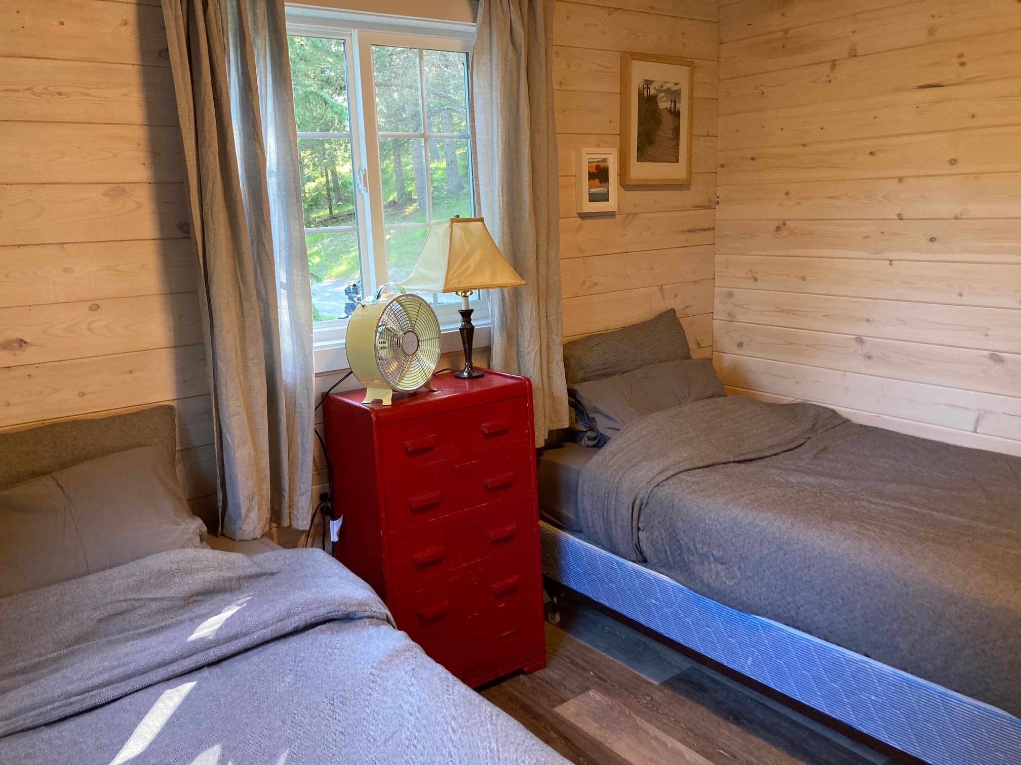 This cabin is our newest renovation for 2024. Located on the water right in front of the west dock. It is a smaller two bedroom cabin with a queen bed in one bedroom and a small bunk bed room with tow singles. A flush toilet and sink is provided with access to a central shower building.(Dog free cabin)